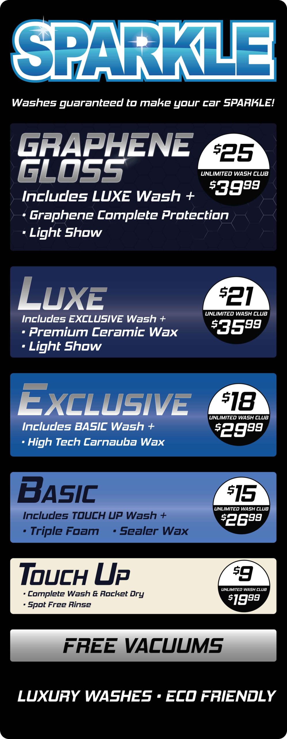 Want your car to sparkle? Visit Sparkle Car Wash to get your Car SPARKLING Clean today!! Stop by between 7am-8pm every day of the week to try out our NEW Graphene Gloss with premium light show. Our state-of-the-art washing technology is specially designed to deliver a more eco-friendly, higher-quality wash than traditional car washes. Car wash services and packages include: